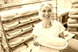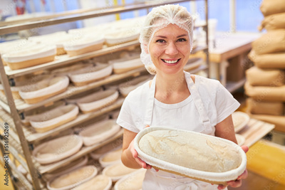 Junge Frau als Bäcker Lehrling zeigt stolz Backform mit Brot