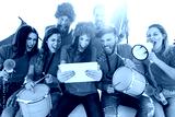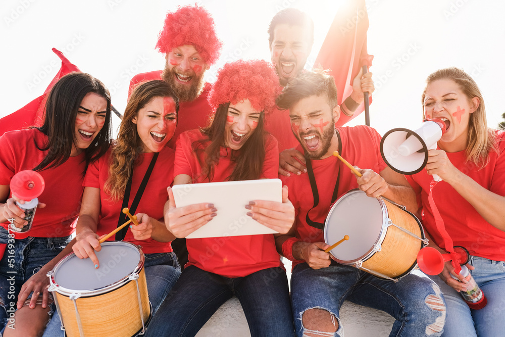 Crazy sport supporters watching football on tablet computer - Focus on front faces