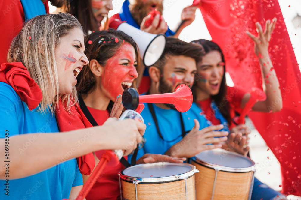 Crazy sport fans playing drums and screaming while supporting their team - Focus on left girl face