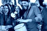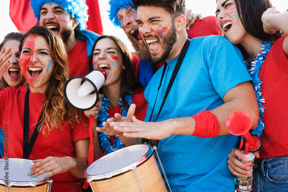 Crazy sport fans screaming while supporting their football team - Focus on right man face