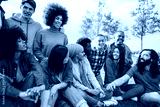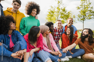 Happy diverse people having fun outdoor sitting on grass at city park - Focus on arabian girl face