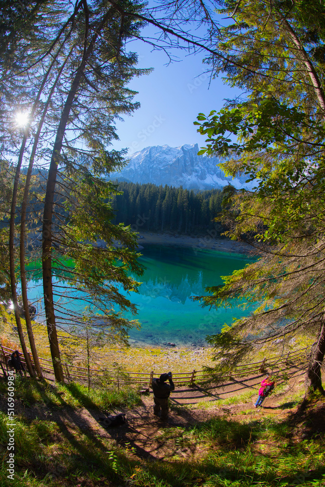 Carezza lake Lago di Carezza, Karersee with Mount Latemar, Bolzano province, South tyrol, Italy. Landscape of Lake Carezza or Karersee and Dolomites in background, Nova Levante, Bolzano, Italy.