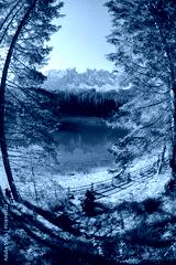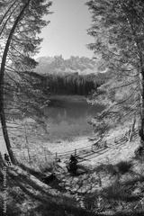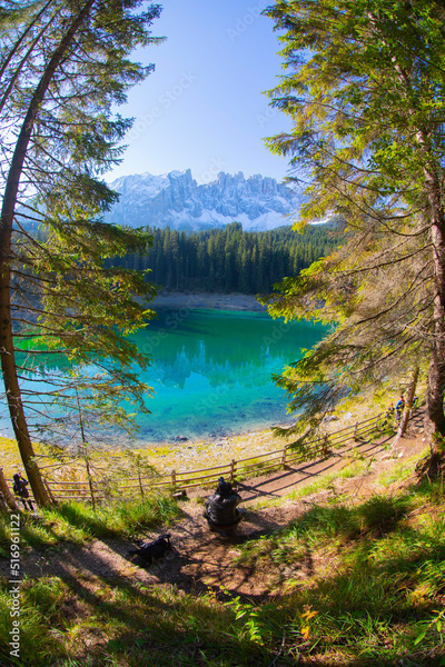 Carezza lake Lago di Carezza, Karersee with Mount Latemar, Bolzano province, South tyrol, Italy. Landscape of Lake Carezza or Karersee and Dolomites in background, Nova Levante, Bolzano, Italy.
