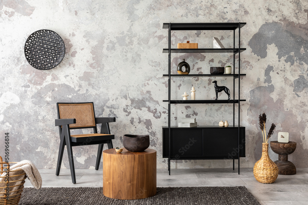 The stylish composition of wabi sabi interior with black rack, rattan armchair, carpet, coffee table and personal accesoories. Grey concrete wall. Home decor. Template.