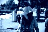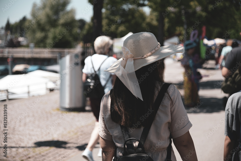 Die frau mit weißem Hut geht auf überfüllten Straßen.