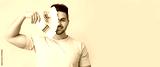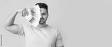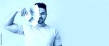 Handsome young man holding color palettes on light background with space for text