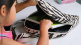 Back to school. Cute Asian elementary school girl packing bags to prepare for the first day of school. Child with school bag and book. Education.
