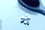 Green comb, pills and fallen hair on a yellow background. Baldness and hair loss problem
