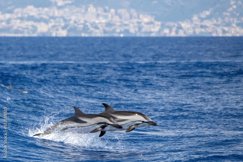 Striped dolphins jumping outside the sea in front of Genoa, Italy