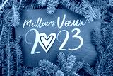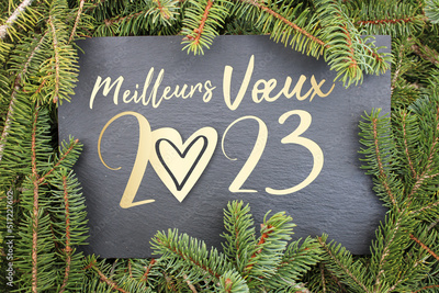 Meilleurs vœux 2023, fond ardoise et branches de sapin