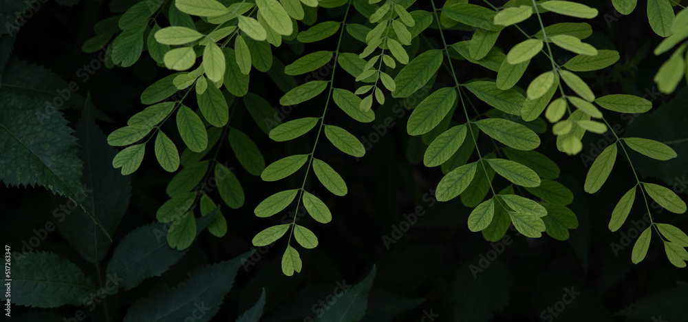 Green leaves on black background. Bright acacia leaves.