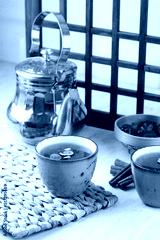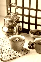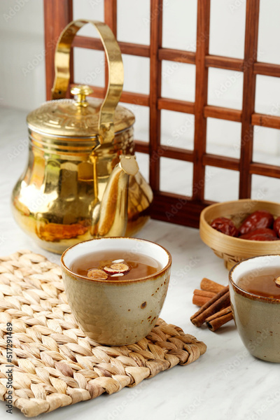 Close Up of Sujeonggwa Persimmon Punch with Ice and Dried Persimmons in a Ceramic Cup, South Korean Drink