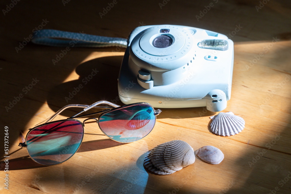 Horizontal selective focus still life with a summer vacation vibe, including retro style camera, turquoise sunglasses and shells on wooden background
