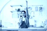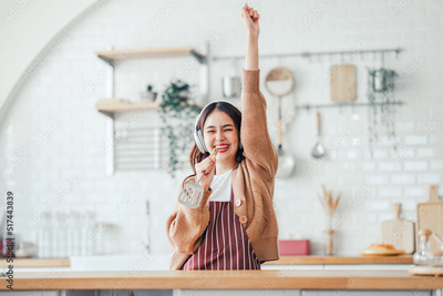 Happy carefree asian woman wearing headphones and ladle singing have fun moving listening to music relax in kitchen, She dance enjoy leisure weekend at home.