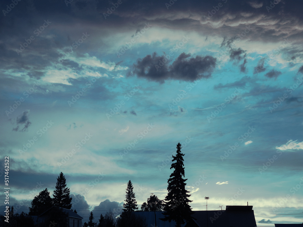 Sunset in village. Pastoral and bucolic dramatic background about summer evening or nightfall in countryside. Sky and clouds. Silhouettes of buildings and trees. Blue and violet tinted landscape