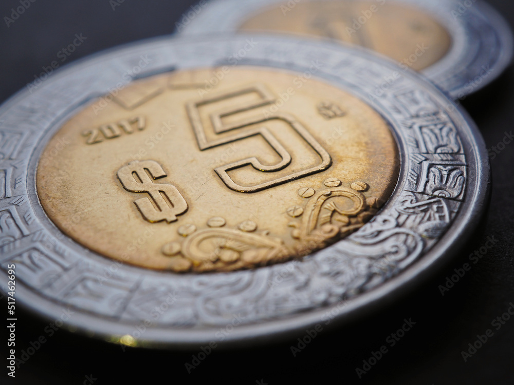 Coin of 5 five Mexican pesos close-up. Peso of Mexico. News about economy or banking. Loan and credit. Wages and money. Focus on peso symbol sign. Macro