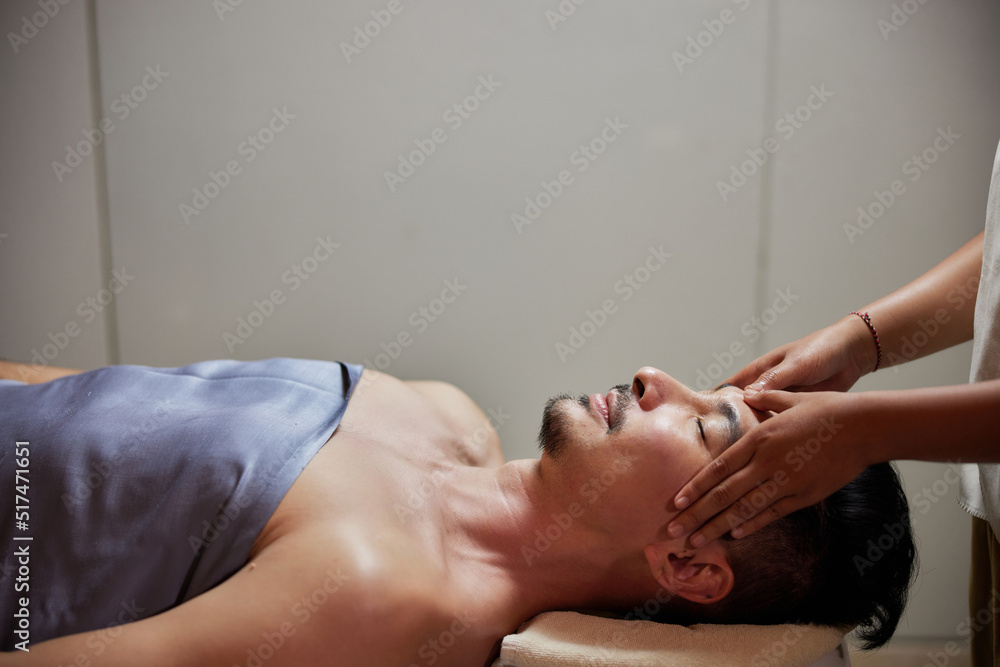 Face massage. Close-up of young man getting spa massage treatment at beauty spa salon. Spa skin and body care. Facial beauty treatment. Cosmetology.