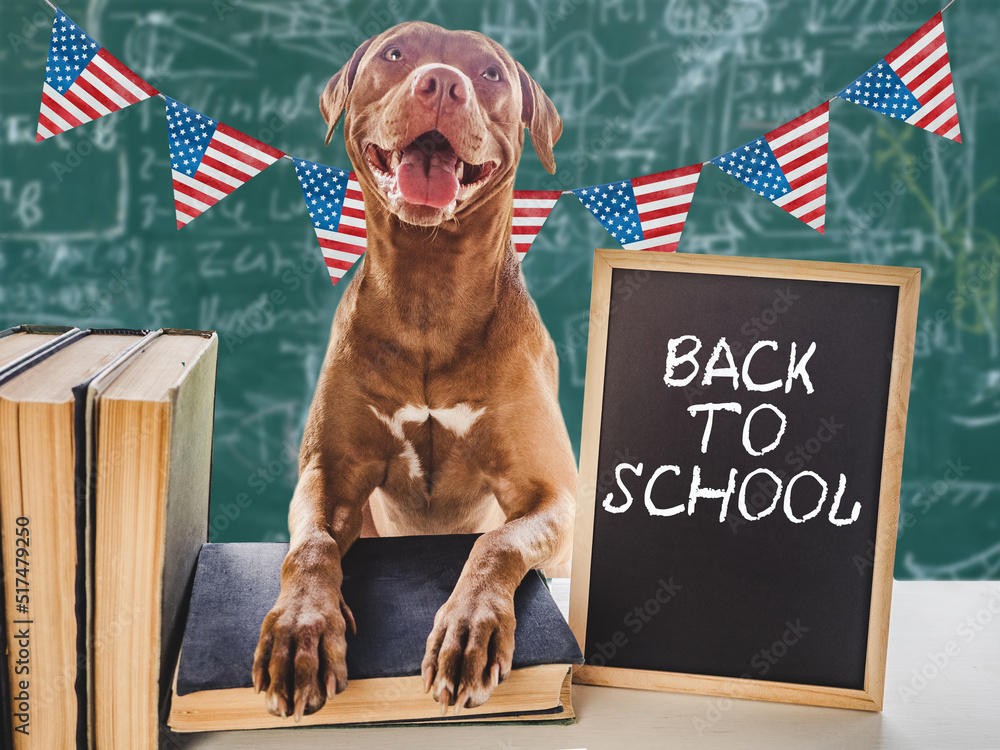Back to school. Lovable, adorable puppy and vintage books. Close-up, isolated background. Studio shot, day light. Concept of care, education, obedience training and raising of pets