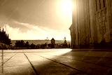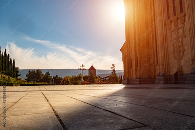 Temple area illuminated by the setting sun. Tsmind Sameba (Holy Trinity) in Tbilisi