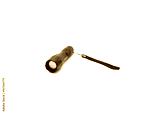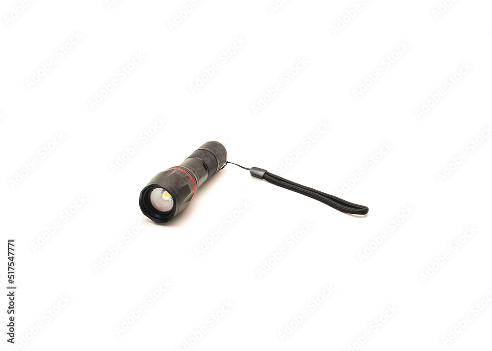 Close-up lotus head shape of black aluminum alloy flashlight with lanyards handle isolated on white background