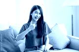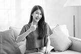 Satisfied asian woman looking at camera with thumbs up sitting on a couch in the living room at home.