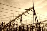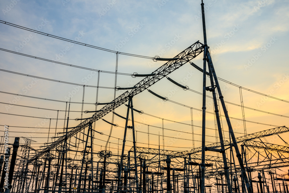 High voltage power tower in substation. Transmission power line. Electricity pylons and sky clouds background at sunset.
