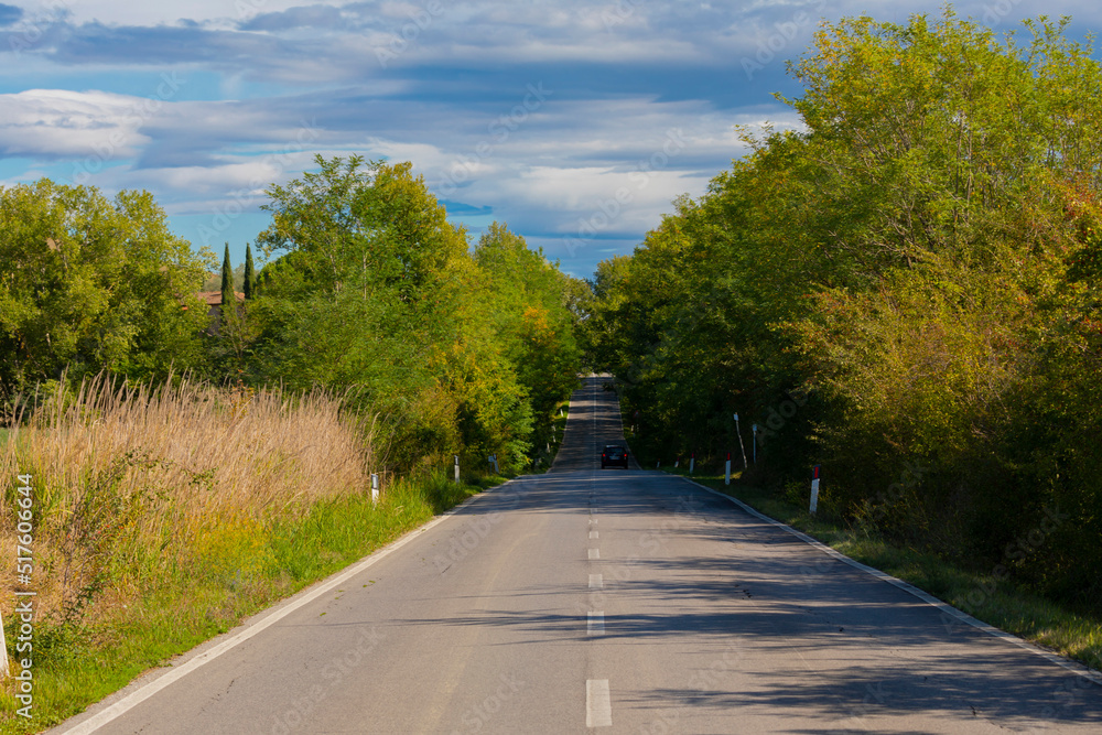 Tree alley in front of farmhouse, near Montalcino, Tuscany, Italy