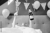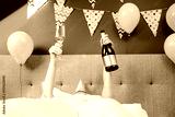 Woman lying on bed with arms raised, holding glass of champagne and tv remote controller. Passive Birthday plans. Time for yourself. Holiday at home. Happy birthday. Selective focus.