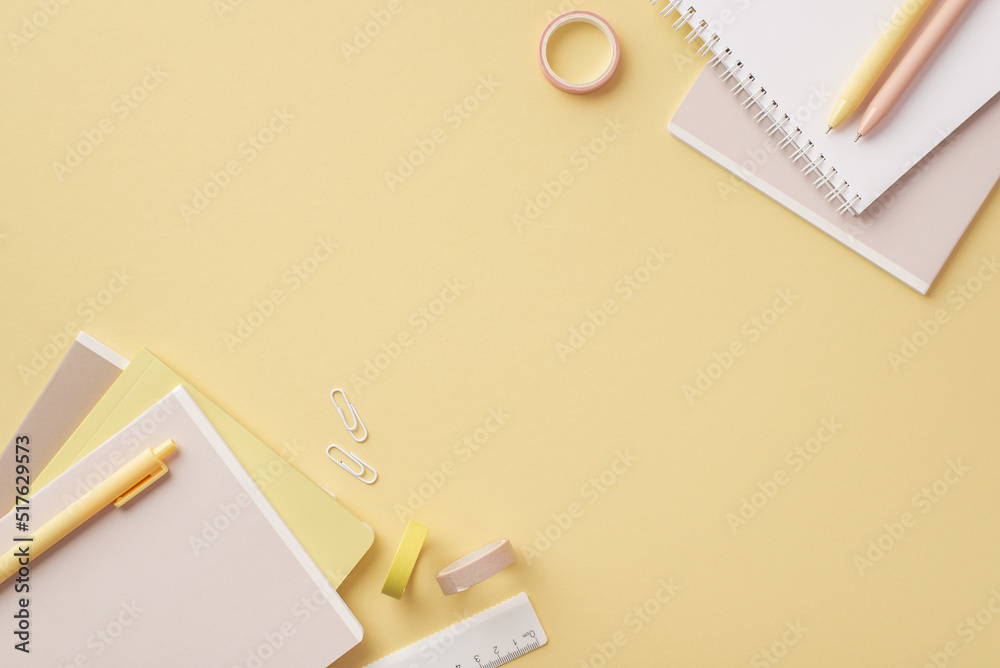 Back to school concept. Top view photo of stationery diaries pens ruler clips and adhesive tape on isolated pastel yellow background with copyspace