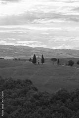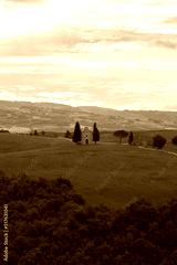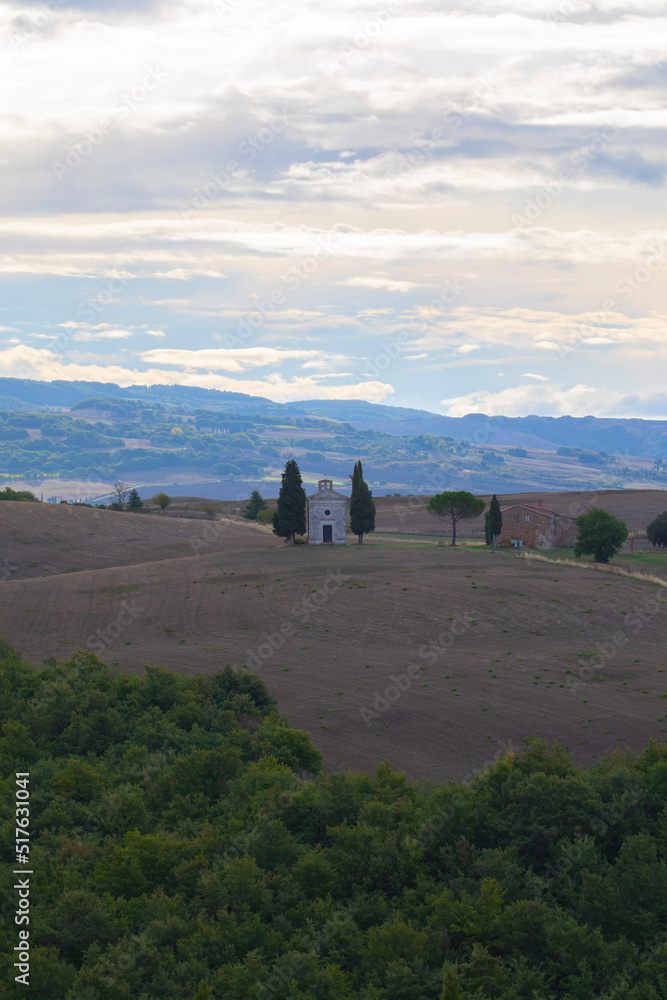 Tuscany landscape at sunrise with a little chapel of Madonna di Vitaleta, San Quirico d'Orcia, Italy
