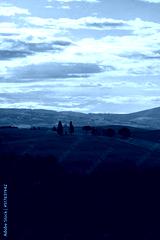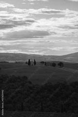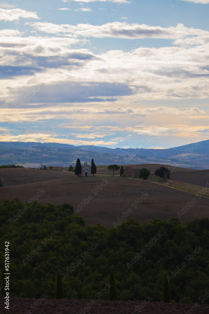 Tuscany landscape at sunrise with a little chapel of Madonna di Vitaleta, San Quirico d'Orcia, Italy
