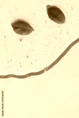 Transparent cosmetic gel or serum of yellow color with green leaves on a light beige background. The concept of natural cosmetics. Top view.