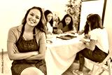 Group of women drawing sitting on the table. Hispanic woman smiling happy with arms crossed gesture at art studio.
