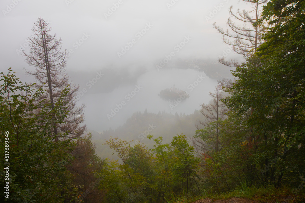 Famous island with old church in the city of Bled. Misty morning with gorgeous lights and colors. Alps mountains in the background. Slovenia, Europe