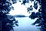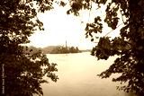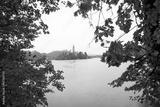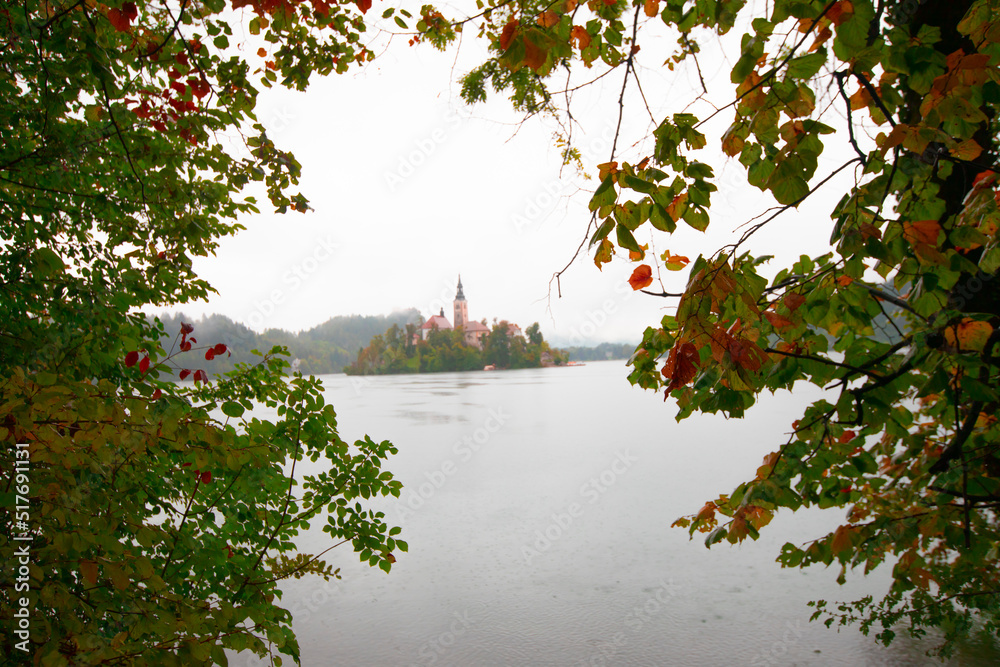 Famous island with old church in the city of Bled. Misty morning with gorgeous lights and colors. Alps mountains in the background. Slovenia, Europe