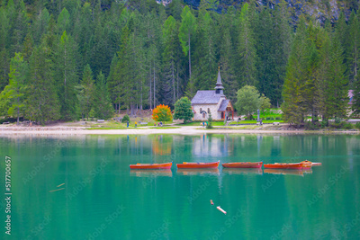 Little chapel at Lake Braies (Pragser Wildsee, Lago di Braies). Fanes-Sennes-Braies Nature Park in the region of Trentino Alto-Adige, Dolomites, Italy