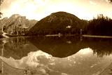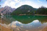 Emerald Mountain Lake Braies. boat station. Wooden pier. Morning landscape in Italy