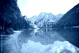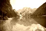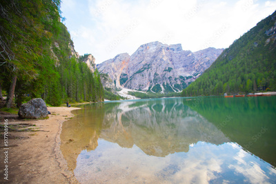 Emerald Mountain Lake Braies. boat station. Wooden pier. Morning landscape in Italy