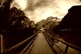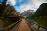 Emerald Mountain Lake Braies. boat station. Wooden pier. Morning landscape in Italy