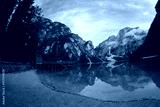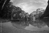 Emerald Mountain Lake Braies. boat station. Wooden pier. Morning landscape in Italy