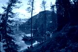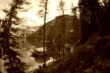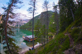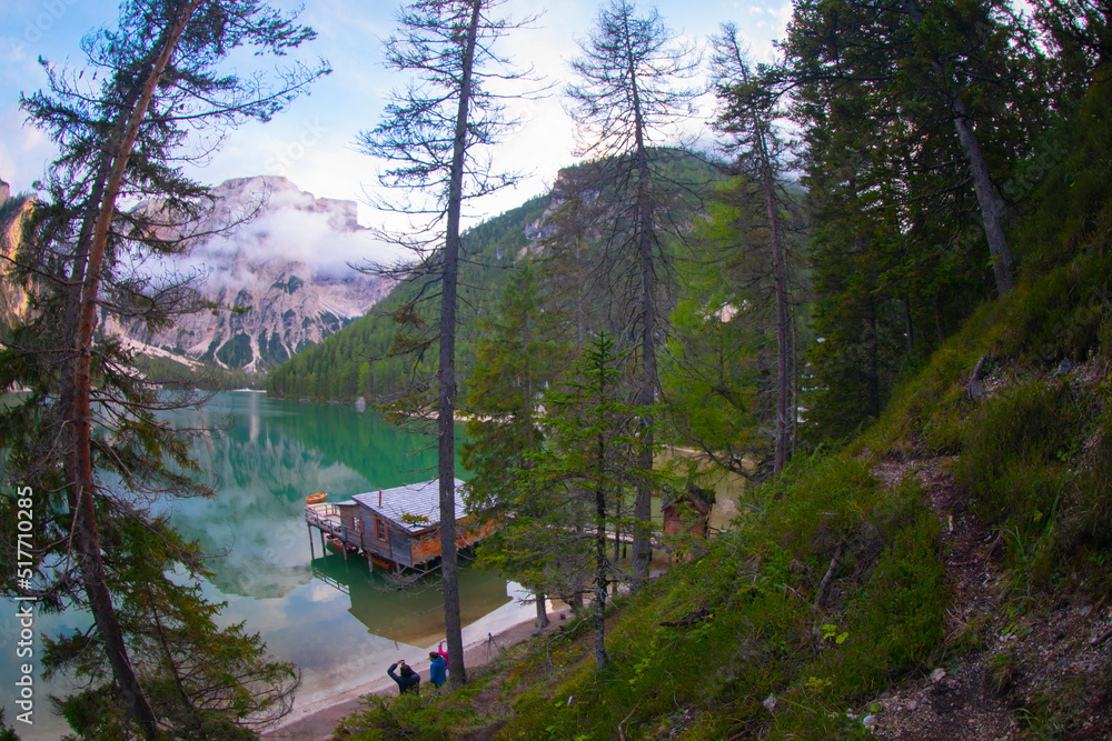 Emerald Mountain Lake Braies. boat station. Wooden pier. Morning landscape in Italy