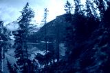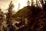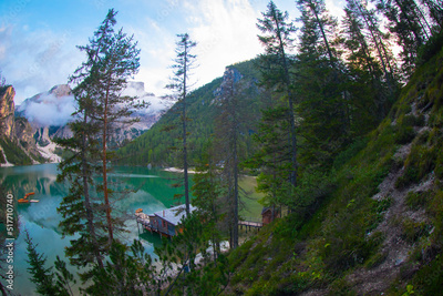 Emerald Mountain Lake Braies. boat station. Wooden pier. Morning landscape in Italy