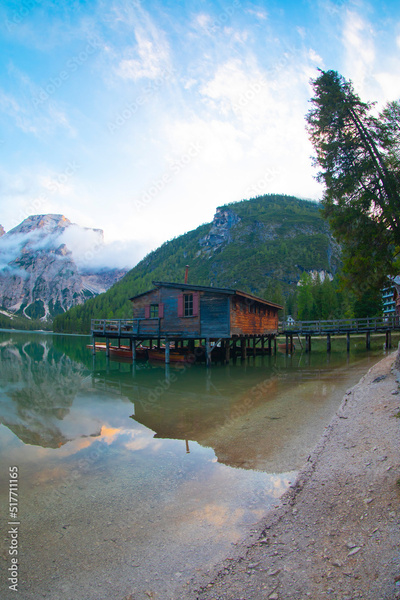Pragser Wildsee or Lago di Braies. Italian Alps, Dolomites, UNESCO world heritage site, Fanes-Senes-Braies nature park, South Tyrol, Trentino-Alto Adige, Italy