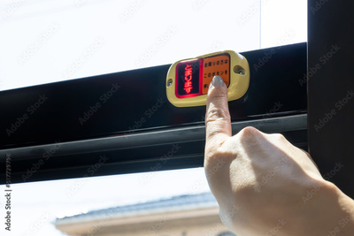 バスの降車ボタンを押す女性