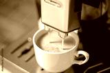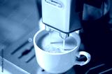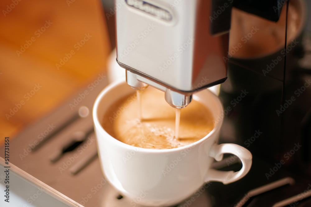 Modern coffee machine with a partially full cup of coffee on table in kitchen