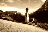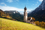 St. Valentin (Kastelruth) Village Church at the autumn Dolomite Alps. Amazing landscape with small chapel on sunny meadow and snowy Petz peak at Kastelruth commune. Dolomites, South Tyrol, Italy