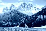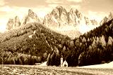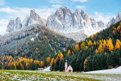 Santa Maddalena Village Church at the autumn Dolomite Alps. Amazing landscape with small chapel on snowy meadow at Santa Magdalena commune. Dolomites, South Tyrol, Bolzano, Italy