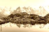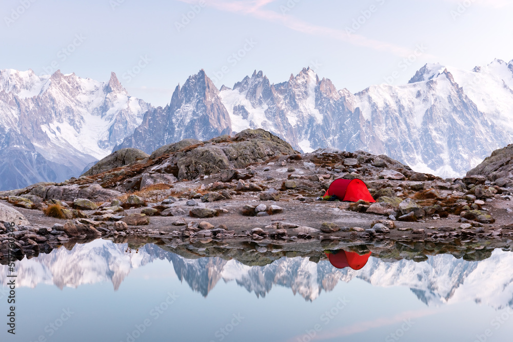 Red tent on Lac Blanc lake coast in France Alps. Monte Bianco mountains range on background. Landscape photography, Chamonix.