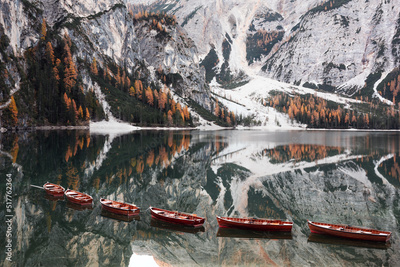 Picturesque landscape with famous lake Braies in autumn Dolomites mountains. Wooden boats and pier in clear water of Lago di Braies, Dolomite Alps, Italy. Seekofel mountain peak on background