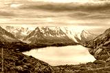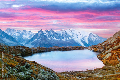 Colourful sunset on Chesery lake (Lac De Cheserys) in France Alps. Monte Bianco mountain range on background. Vallon de Berard Nature Preserve, Chamonix, Graian Alps. Landscape photography